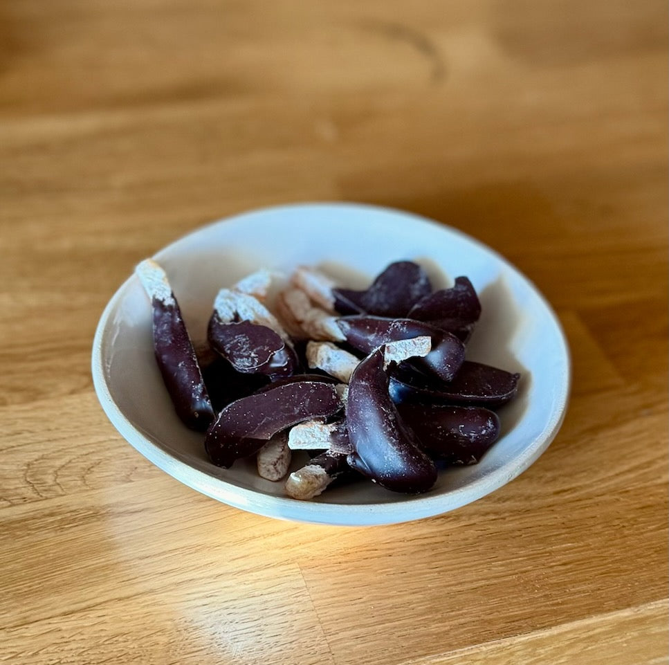 Gently candied strips of orange peel hand-dipped in São Tomé single origin dark chocolate by the Highland Chocolatier. Perfect for a little bite of something sweet!